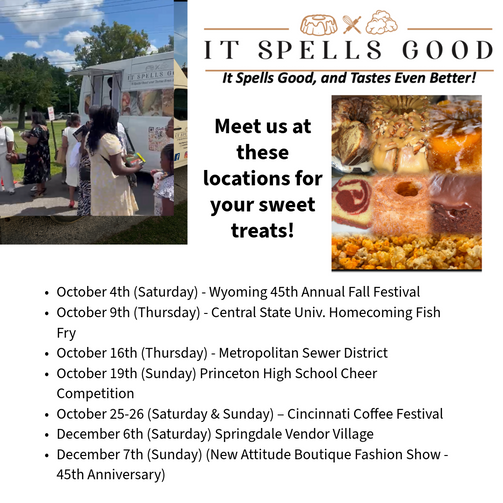 October Schedule: Due to our heavy event schedule, online ordering is limited until November. Please call 513-305-0564 if you have an urgent request.