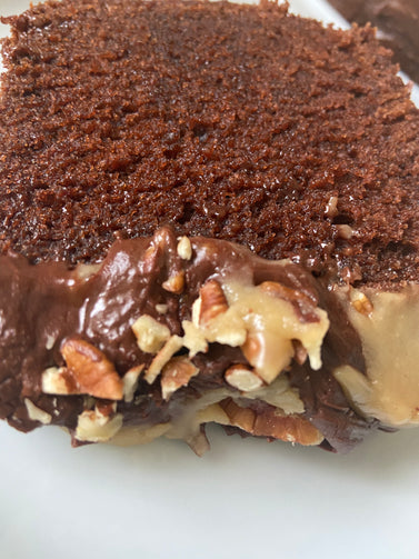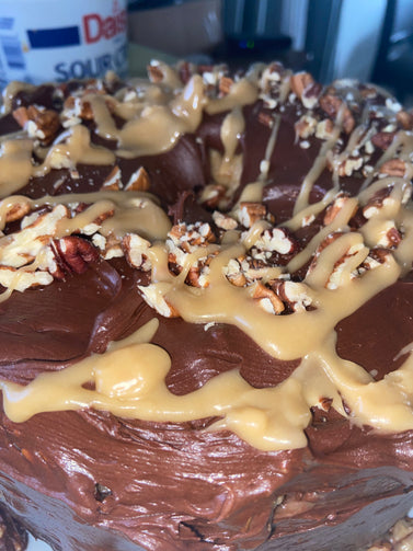 Every It Spells Good pound cake is made with butter, flour, sugar, and eggs. We mix the ingredients together with perfection to deliver a flavorful, moist, and dense cake to you. The Hershey's Cocoa used for this cake is just the right amount to make this chocolate cake divine. What takes it over the top is the layer of caramel icing, topped with chocolate icing, topped with pecans. You won’t be disappointed.